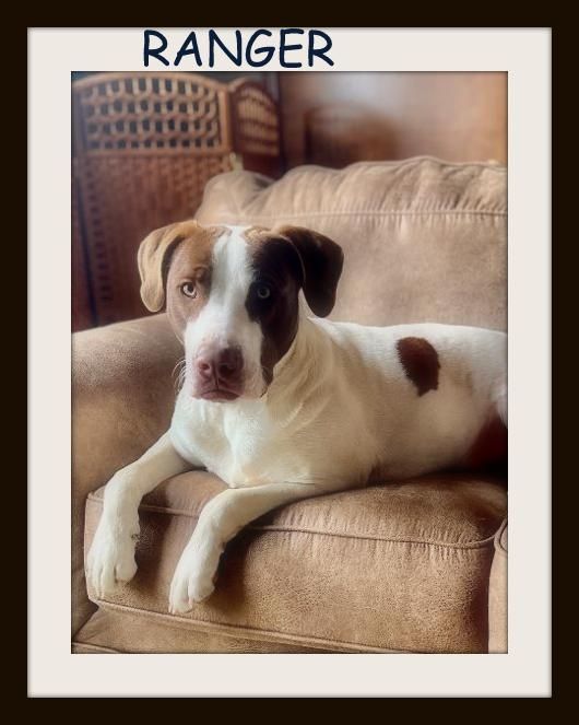 Ranger is a year and a half male, neutered, Pointer/Lab mix. He is housebroken and gets along well with all other dogs , especially small ones he can play with. No info on cats. For some reason he has not been adopted and maybe because some people say he looks like he has a squirt of pit bull...who knows. Ranger needs an active family with kids and lots of play time. He loves kids and definitely needs some training!