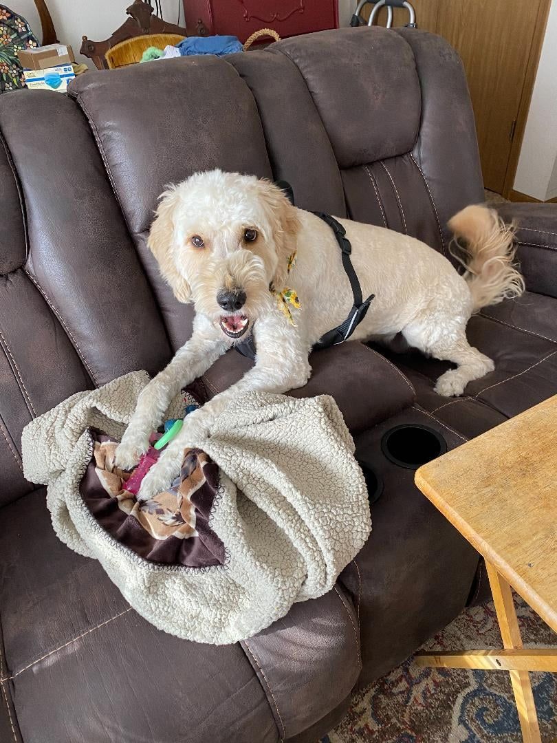 She is a 2 yr old spayed Golden Doodle who needs a new home. Her parents are senior citizens and have declining health. They love her but keep falling down when walking her as she is strong and lively. Angel does not do well with cats or small dogs as she gets too rough. She is housebroken, loving, fun and will make a young couple a great pet!! She is timid and takes awhile to trust you.