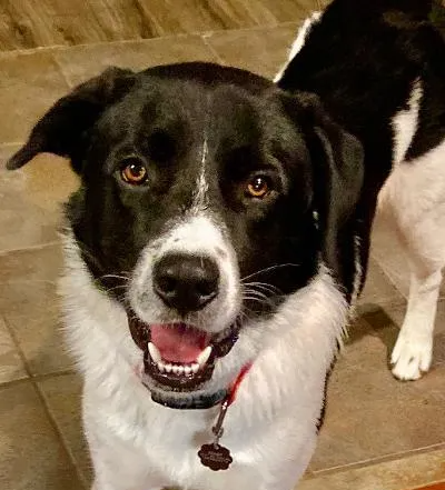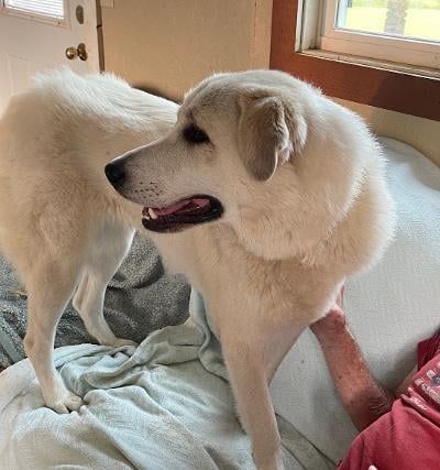 Blake is a 1 - 1/2 yr old Pyrenees/border collie mix (with no traits of BC) who is neutered, and current on shots. He is mostly housebroken, but not 100% guarantees, and weighs 90 lbs. Blake is fine with kids, cats and all dogs. He is a gentle giant but will jump a 5 ft fence. He does not roam off but loves to run in the country!!!