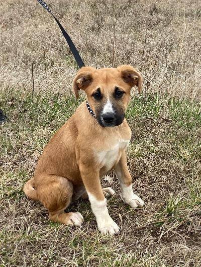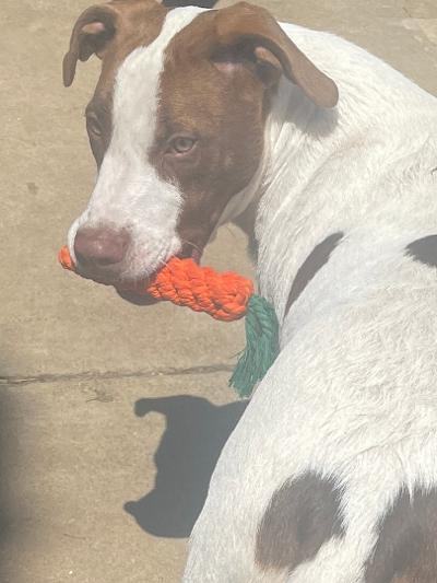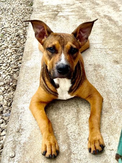 Chief is a 7 month old pit bull mix terrier....have no idea what he is mixed with! He weighs about 40 lbs now and is very shy initially. Once he gets to know you , he gets super excited and wants to jump around on your lap. He is not leashed trained and definitely needs to have some kind of training and lots of exercise. He has been in a small pen with three siblings and we think he was picked on. He will take a loving, patient family who will work with him. He is really adorable!!!