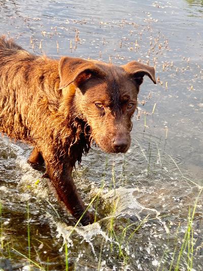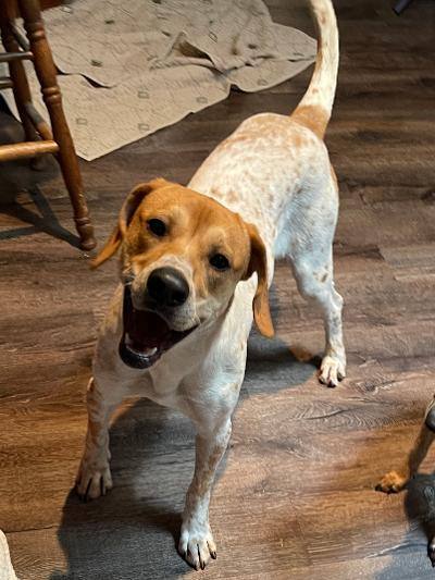 Lucy is a German wired haired pointer. She could possibly be mixed with some lab. She is around a year old and fully vaccinated along with being spayed as well. Lucy is around 45 pounds. We do not think she will get any bigger. She is good with kids, LOVES swimming, good around dogs if there is not too many. Lucy appears housebroken, however that is on the family for training.