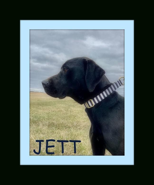 Jett is most probably a purebred black lab about a year and a half old. He is neutered and perfectly behaved. He is good with kids, does not jump a fence and no bark yet! No info on cats...we do not have any here. He is still too thin, but gaining slowly and has energy to run like a jet! He flies across our fields with all of our dogs racing behind him...no one can catch him. We adore him...just wish all of our dogs were this good. Oh yes, he did tear up a doggie bed so he is not perfect, but close.