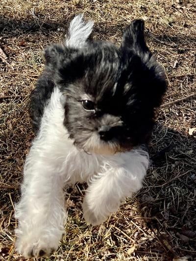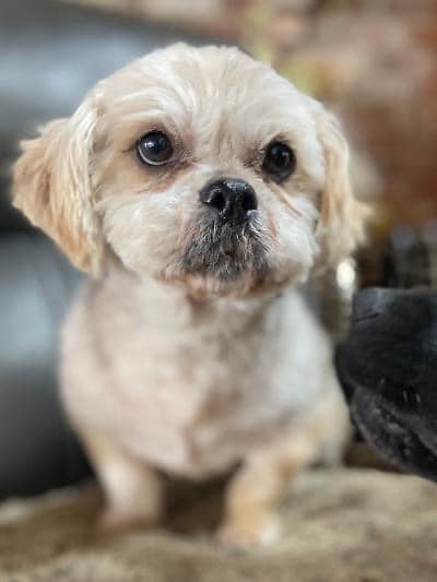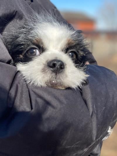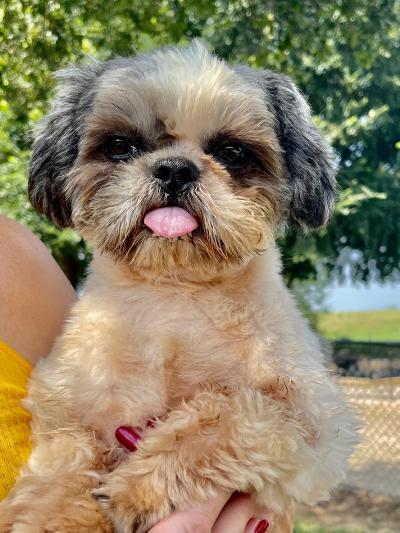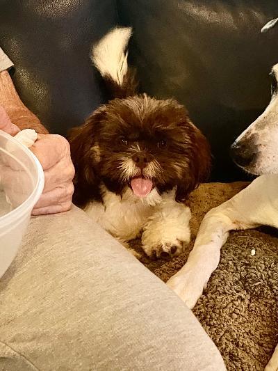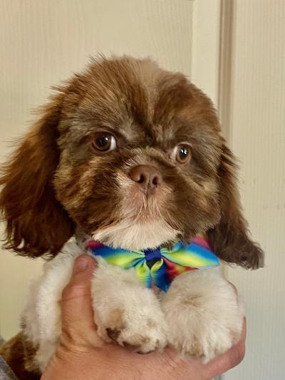 Paddington is a purebred 4 month old Shih Tzu puppy. He is liver and white with a soft fluffy coat. He looks like a stuffed animal who moves! Paddy was rescued from a breeder's auction to keep him from a life in a cage as just a breeder dog. Now he can be a real dog and love life and play. We will not consider a home without another dog.
