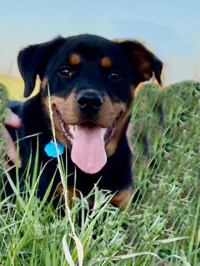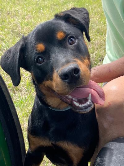 Ripley is a 6 mo old registered female Rottweiler. She is spayed and current on vaccines and comes with papers. Ripley is fine with kids, cats and other dogs. She has been crated too much and has a lot of energy which she runs off here on our 50 acres. She needs another dog to play with who can wear her out, and a family who has time to acclimate her to their home. No underground fences, no shock collars, and no crating. Her owners said she was housebroken, but will probably need brushing up which we feel is the responsibility of the new family.