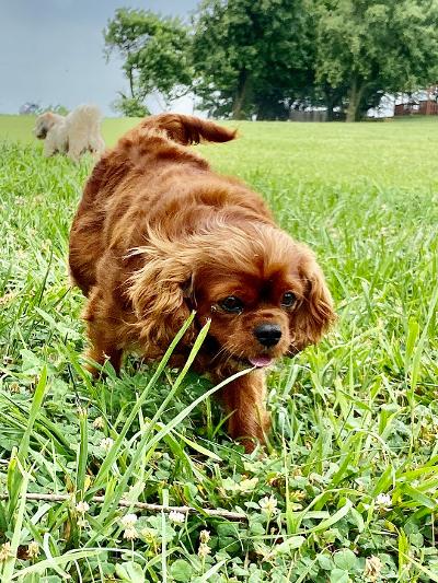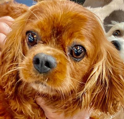 Robin is a five year old purebred Cavalier King Charles Spaniel. She loves everyone, is happy and outgoing. When kids come, she runs to them wagging her tail. The breeder released her because she was not "producing." When we got her I noticed right away she would squat several times to go potty, so when we had her spayed and got a dental, i asked the vet to check it out. What she found, and removed, was a LARGE bladder stone. We are waiting for the results of the stone to find out if she needs to be on a special diet.. It should be another week or two. In the meantime, she plays all day and joins all of us at the pond, Needless to say, she will be the best companion ever!!