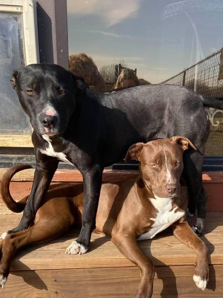 These two males are now 6 months old and weigh about 30 lbs.. They are up to date on shots, neutered and bonded therefore we are looking for a home together. Wilbur is the black one and is more timid and relies on Orville for his confidence. They are probably lab/pit mixes and are totally non aggressive and do well with other dogs and love kids. I suspect they will not get over 35-40 lbs when they are full grown.